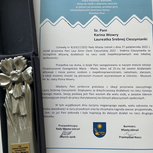 Dlaczego tyle różnych projektów na przestrzeni lat? Wynikało to częściowo ze wsłuchiwania się w ludzi, w ich potrzeby, oczekiwania, pragnienia, z próby zrozumienia czego im brakuje i w jaki sposób ten brak można zapełnić. To Bóg pozwolił mi dostrzec przestrzeń, którą należałoby wypełnić, a którą wypełnić mogłam. Najtrudniejsze w tym wszystkim było samo podjęcie decyzji o działaniu, reszta jest tylko konsekwencją oraz systematyczną pracą. Oczywiście wszystko staje się możliwe do wykonania, jeżeli mamy wsparcie ludzi, ponieważ nikt nie jest wstanie sam bez pomocy osób z otoczenia bliższego czy dalszego zrealizować jakiegokolwiek pomysłu. Bardzo dziękuję tym wszystkim, którzy wraz ze mną tworzyli na przestrzeni 32 lat różne projekty. Szkoda, że ta statuetka srebrnej cieszynianki nie składa się z setek miniaturowych klocków lego, bo należy się ona wielu osobom. Nawet jednak, gdybym miała dać każdemu po jednym klocku w podziękowaniu za wspólne realizowanie różnych zadań to wiem, że dla wszystkich by nie starczyło.